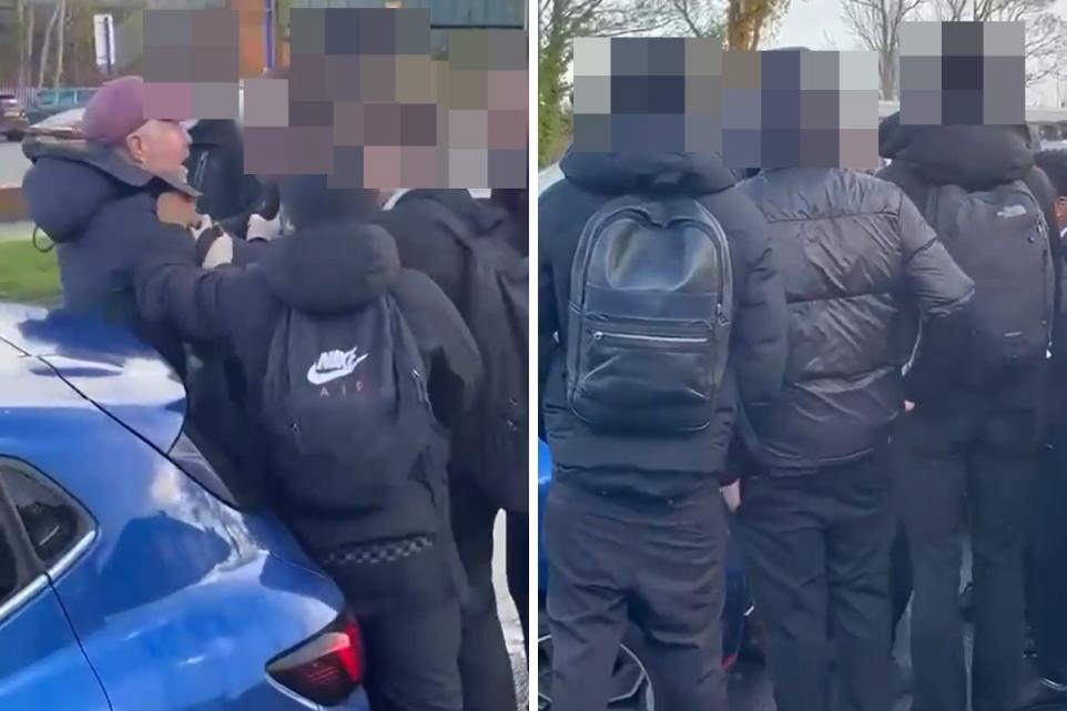 A dad says he was “repeatedly punched in the head” by a group of “violent teenagers” when protecting his 15-year-old son – who is now terrified for his life.